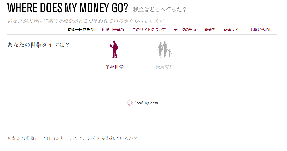 基本的な仕様は自分の年収をスライドバーで調整すると、自分の払っている税金が表示され、使途別にどこにいくら使われているか感じられるものになっています。